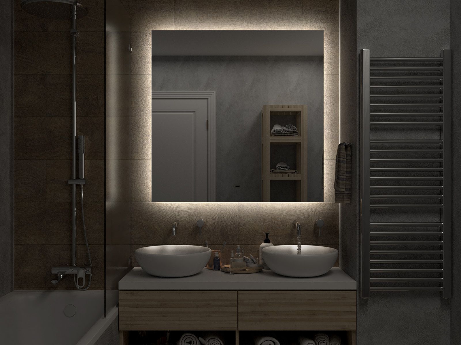 Зеркало с подсветкой для ванной комнаты — это элемент интерьера, который сочетает в себе функции, эстетику и современный дизайн. Его изящная форма и тонкие линии легко вливаются в любое пространство, создавая атмосферу утонченности и уюта.Интегрированная светодиодная подсветка обрамляет зеркало, даря мягкий, рассеянный свет, который не только позволяет удобно наносить макияж, но и наполняет ванную комнату теплом и позитивной энергией.Классический дизайн позволяет использовать его в различных стилях – от минимализма до современного эклектичного оформления. Оно прекрасно вписывается в любую цветовую гамму, будь то нейтральные тона или более яркие акценты.