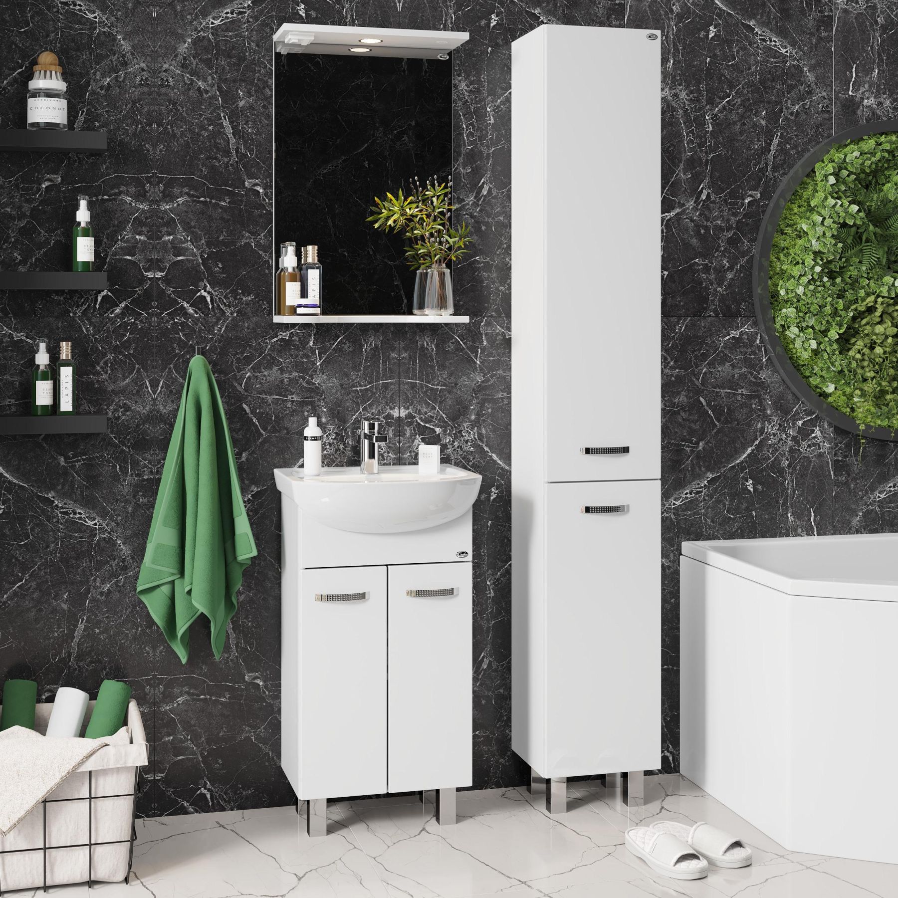 Основа для зеркала выполнена из ЛДСП, полка и козырек - из МДФ в пленке, устойчивых к механическим воздействиям, перепадам температур и высокой влажности.