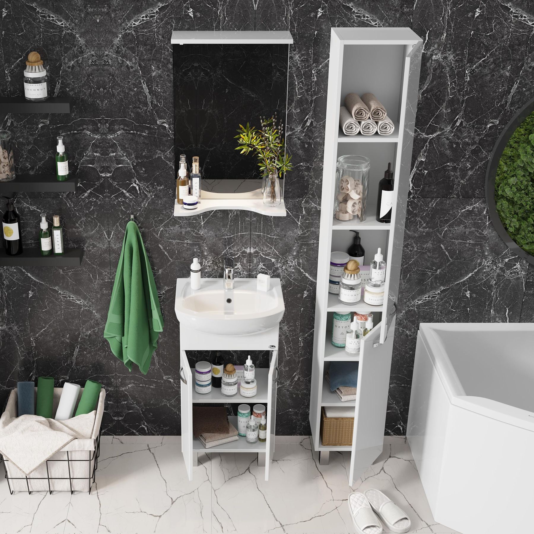 Полка под зеркалом, имеющая удобный вырез, может быть использована для размещения декора или часто используемых предметов.