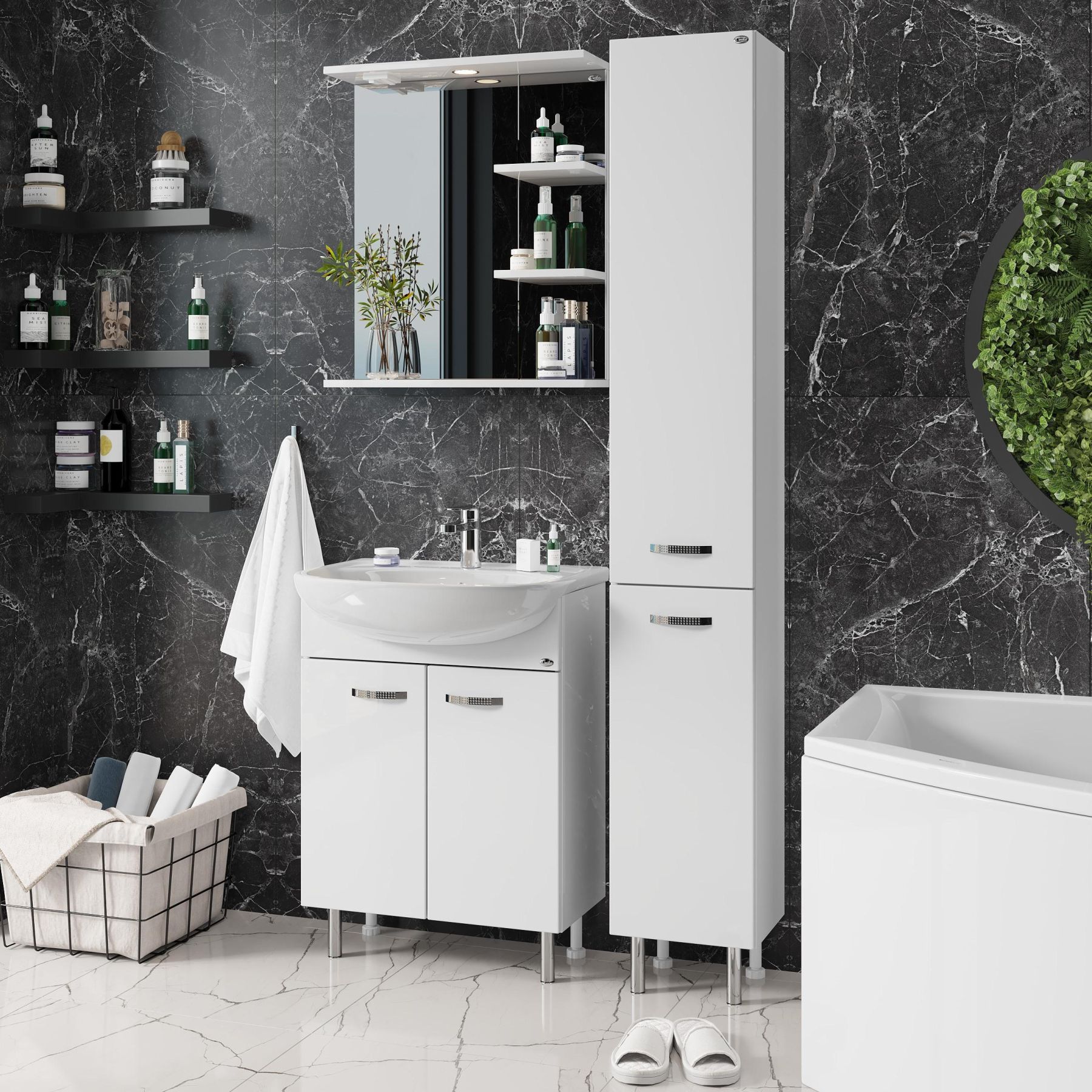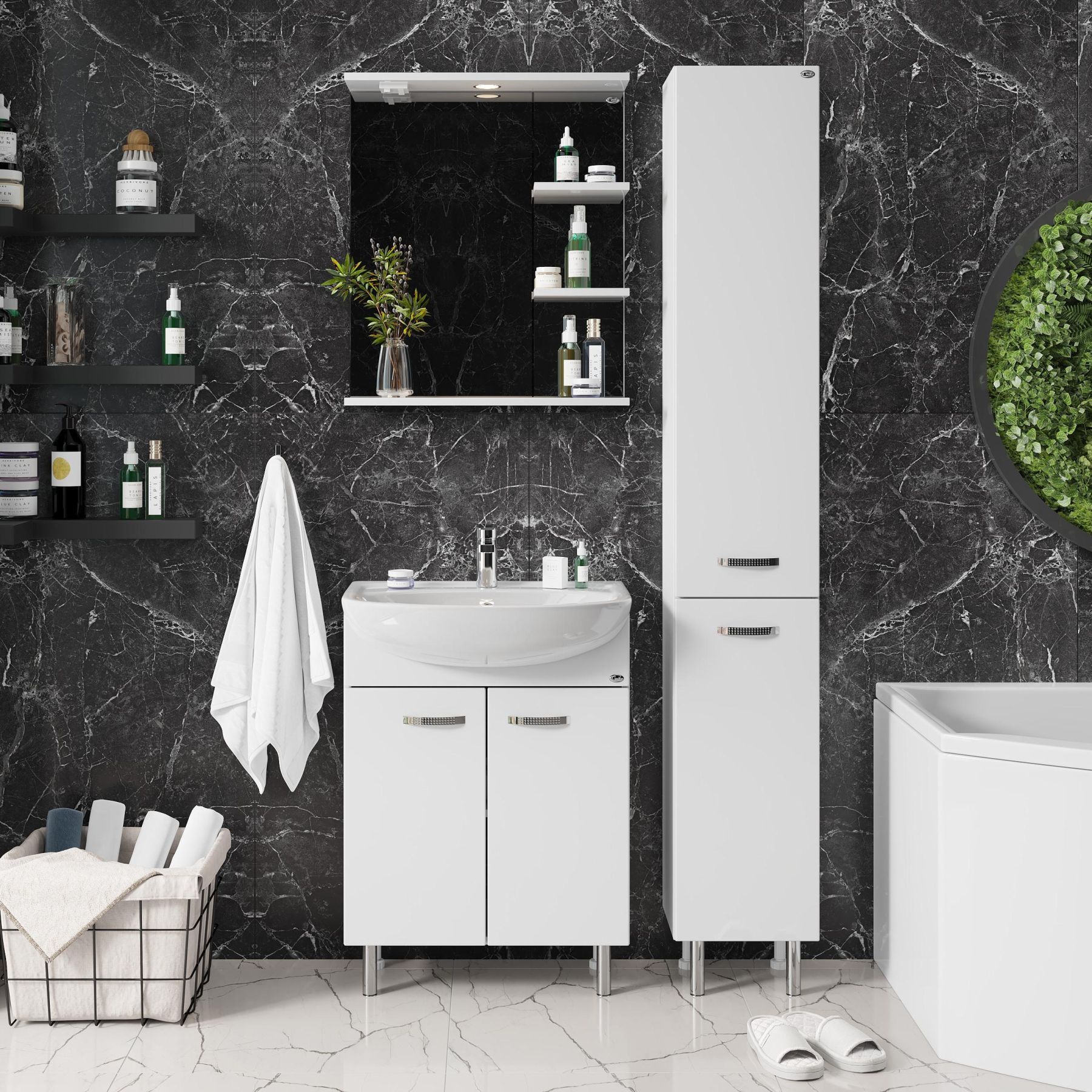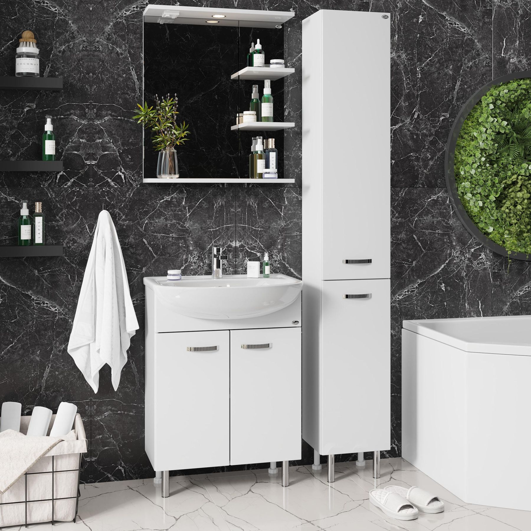 Полка под зеркалом, имеющая удобный вырез, и две небольшие полочки справа могут быть использованы для размещения декора или часто используемых предметов.