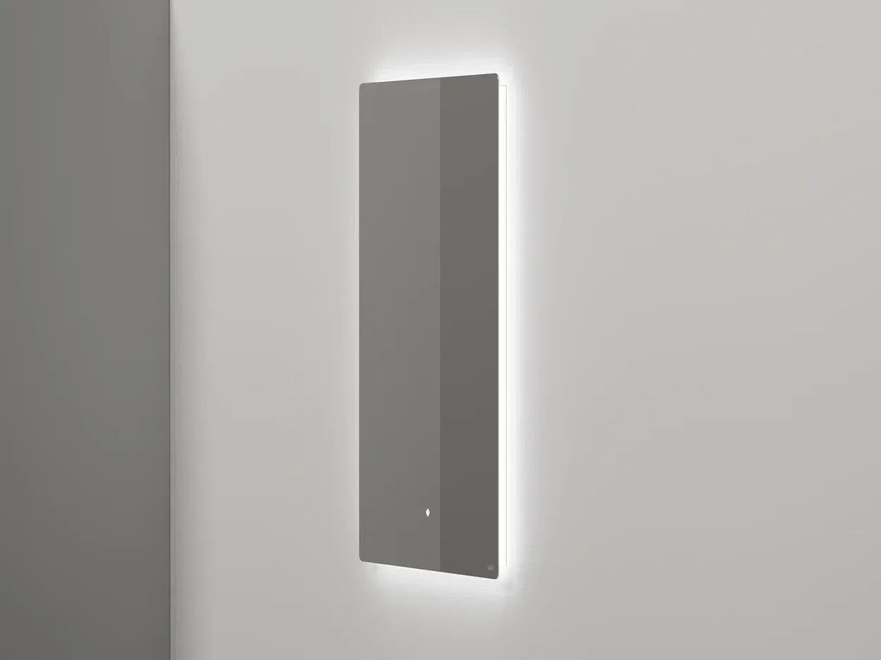 Идеальные линии, шлифовка «Еврокромка», фоновая LED-подсветка по всему периметру, управляемая одним касанием, эффект парящего зеркала благодаря тонкому корпусу в 20 мм, смещённому от края на 15 мм – коллекция OMBRA создана для тех, кто выбирает продуманный, стильный и комфортный интерьер ванной комнаты.