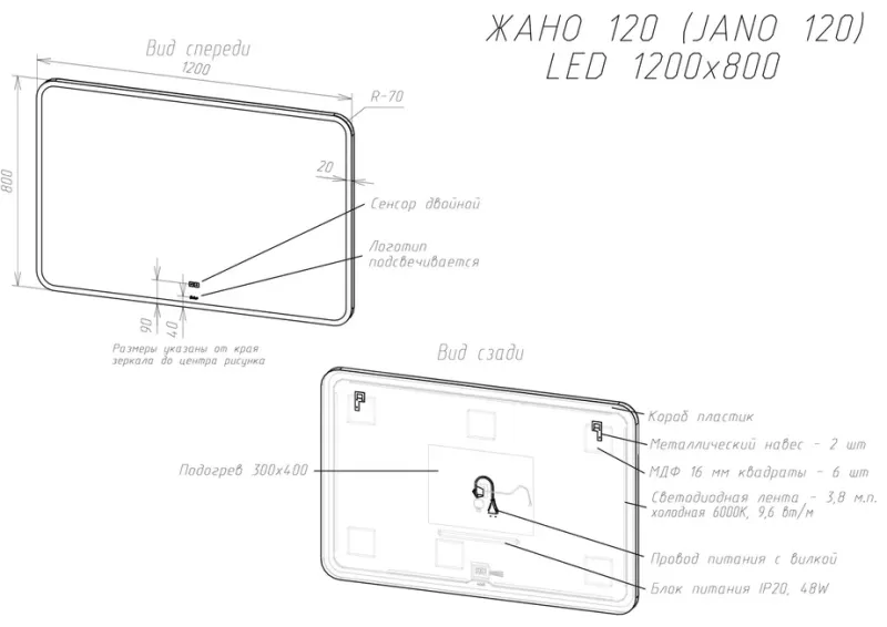 Зеркало настенное JANO 120, 1200х800 с LED-подсветкой - это сочетание стиля и современного дизайна, оно прекрасно вписывается в любой интерьер. Сенсор нового поколения позволяет управлять включением и яркостью Led-подсветки касанием пальца. LED-подсветка рассчитана на 50 000 часов работы в непрерывном режиме. Класс защиты изделия IP 44. Продукция прошла обязательную и добровольную сертификацию. Можно использовать в любом помещение: ванная и туалет, прихожая, спальня, гостиная