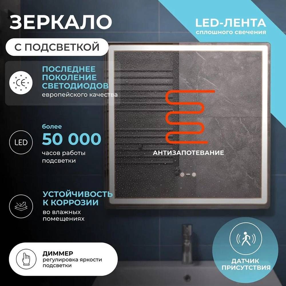 Датчик присутствия, сенсорное управление, светодиодная подсветка, диммер, функция антизапотевания