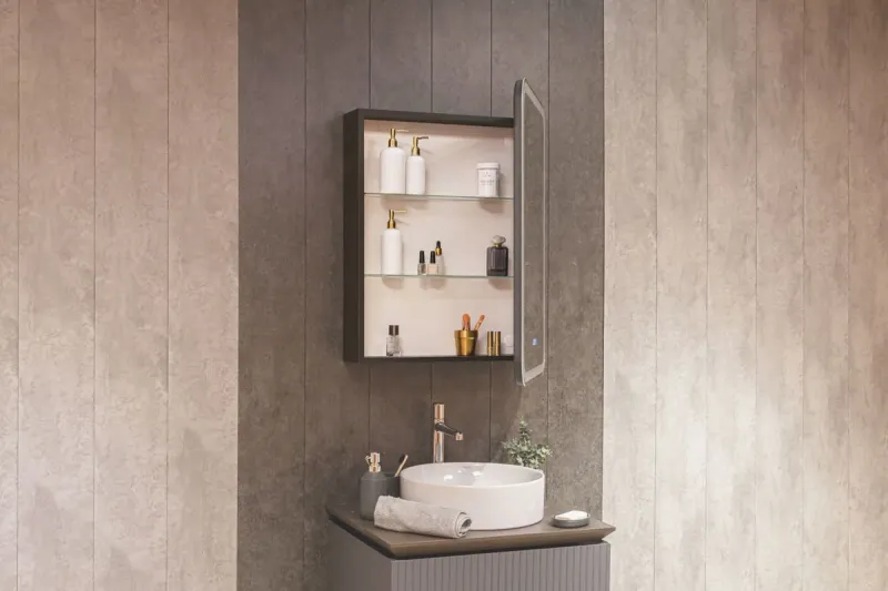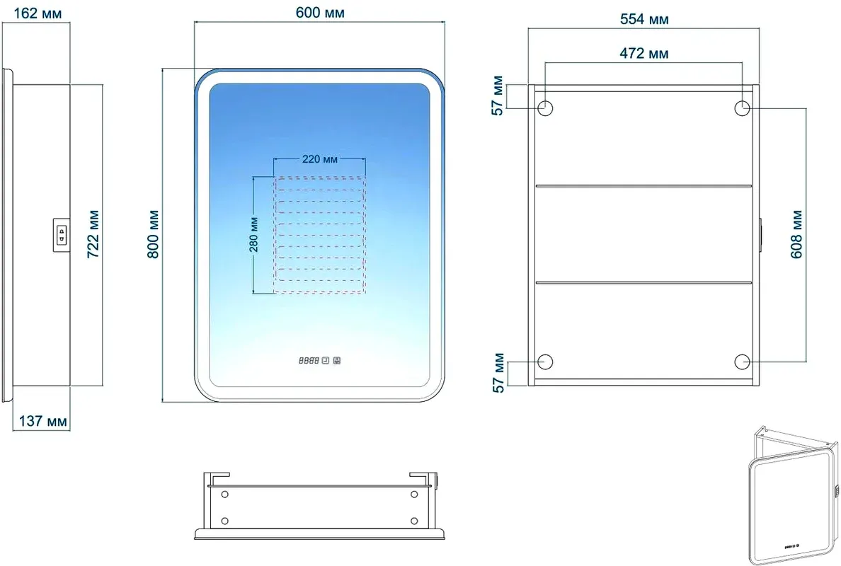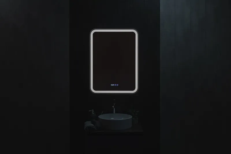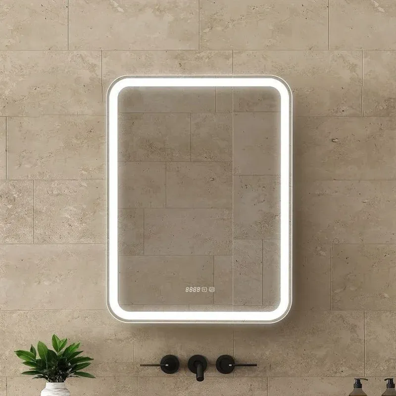 Зеркало-шкаф, оснащенное светодиодной LED подсветкой с диммером, часами и функцией антизапотевания