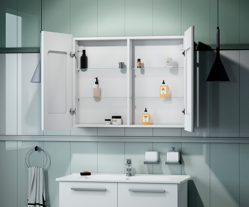 Зеркало-шкаф "Allure Led" 1000х800 с датчиком движения, розеткойLED подсветка 6000К; датчик движения, Материал корпуса - влагостойкий ЛДСП + МДФ в пленке ПВХ, розетка, две створки