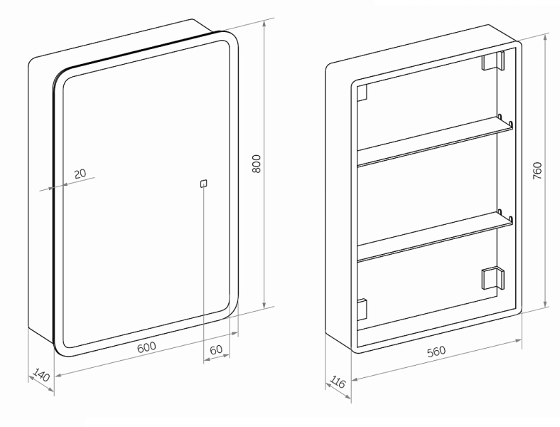 Зеркало-шкаф "Emotion LED" 600х800LED подсветка 6000К; сенсорное включение справа по центру, реверсивные крепления, пластиковый короб, прямые углы на коробе и радиусные на зеркале, полка/2 шт, без розетки, петли Firmax