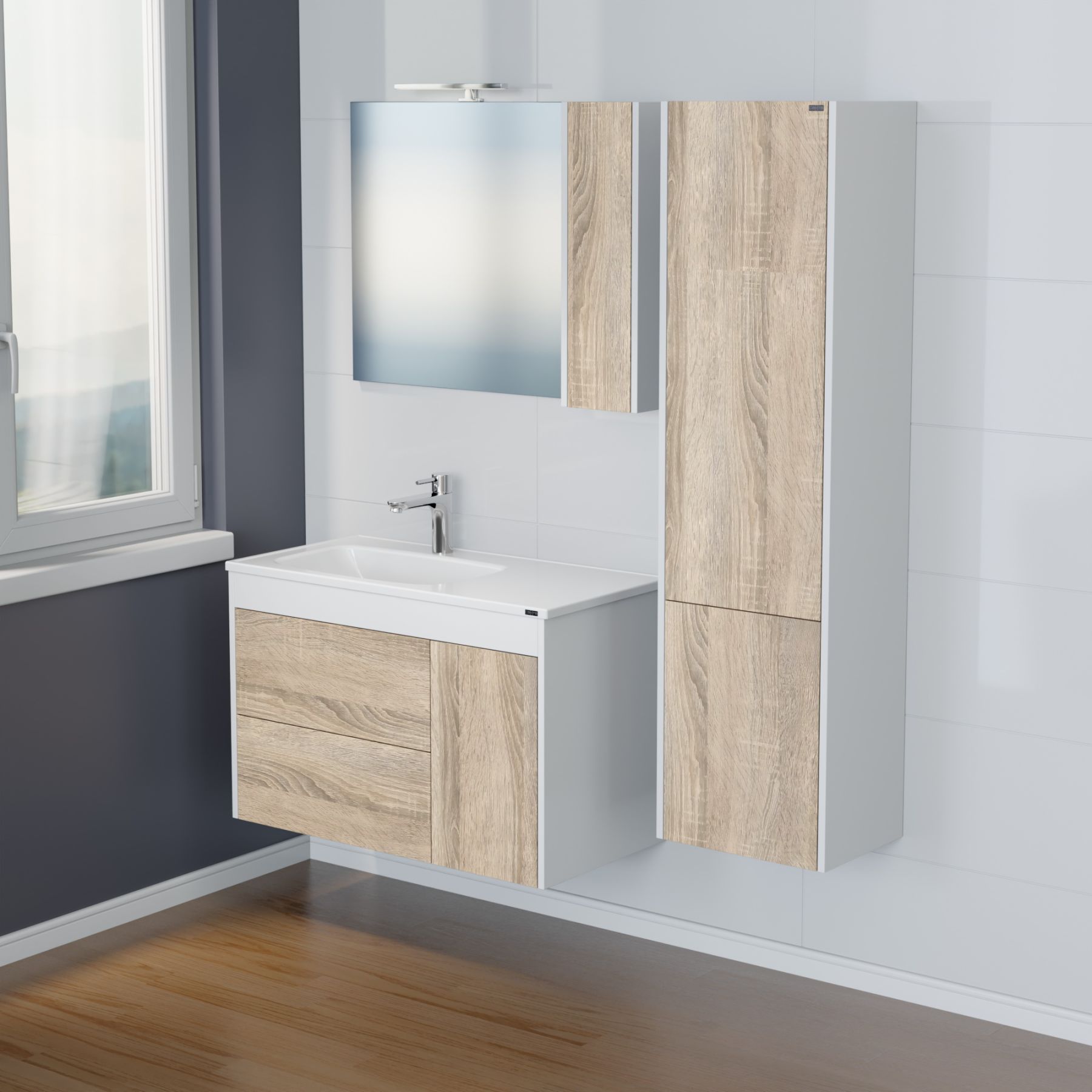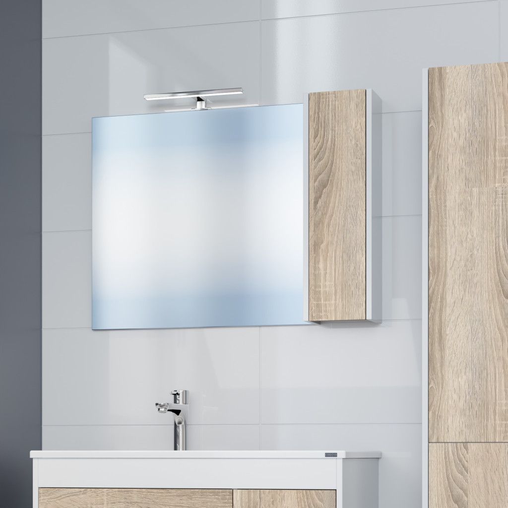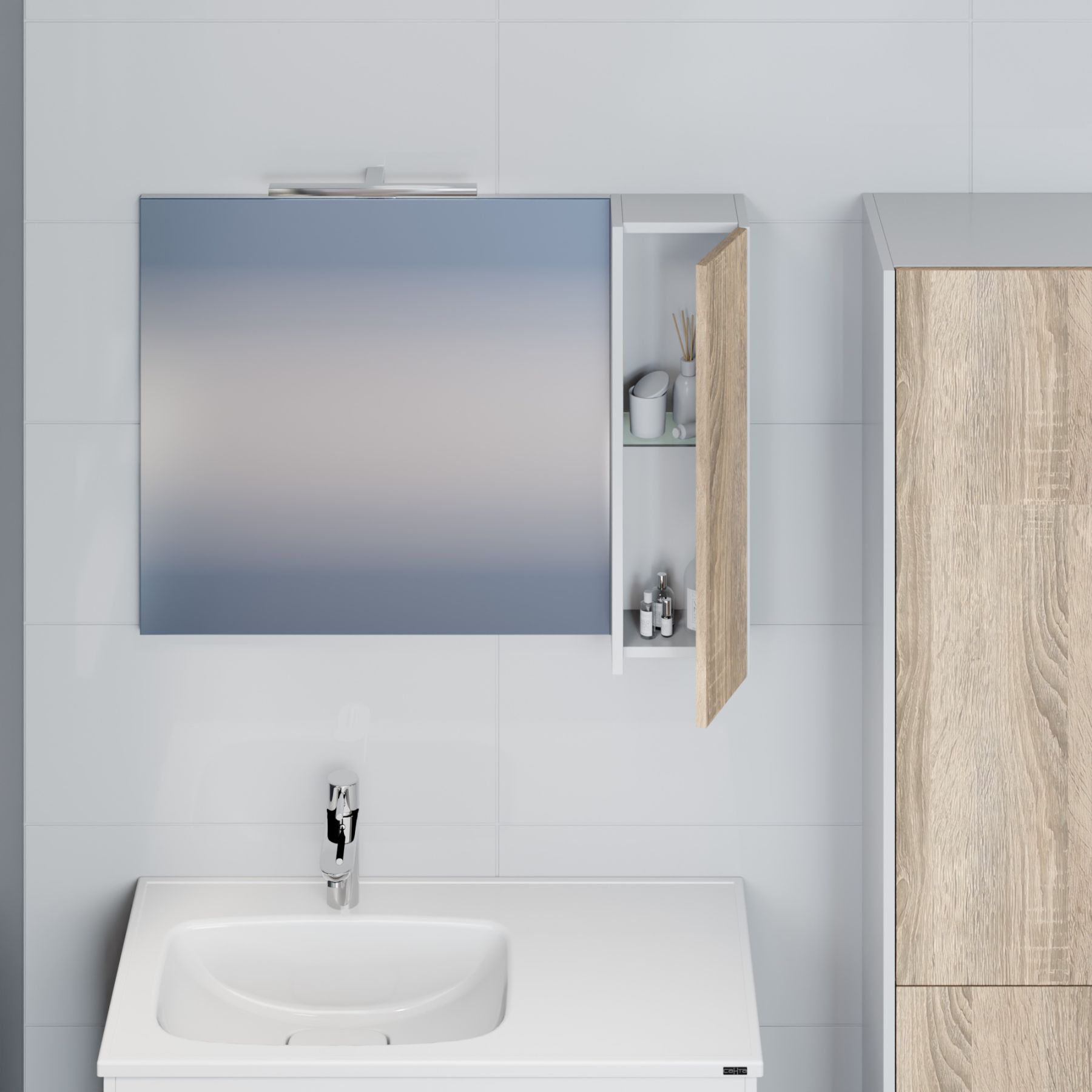Комплектация: петли плавного закрывания, полочки ЛДСП, подвесы, светильник, боковины шкафчика окрашены матовой эмалью