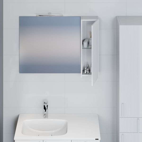 Коллекция мебели для ванной комнты Санта Вега — это современное решение для вашей ванной комнаты. Фасады и боковины выполнены из МДФ и покрыты глянцевой эмалью. Дверцы оснащены петлями плавного закрывания. Фасад зеркального шкафа выполнен с вертикальной реечной фрезеровкой.