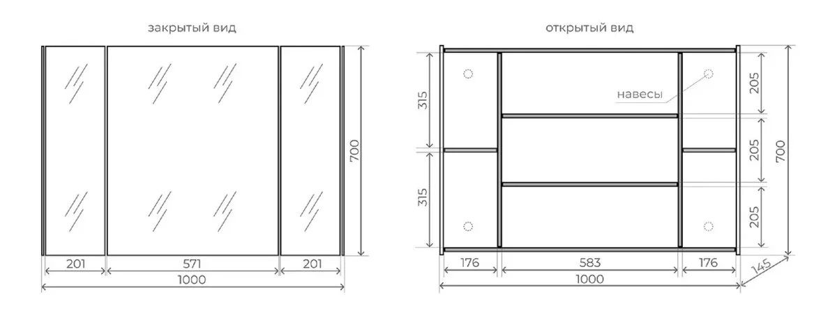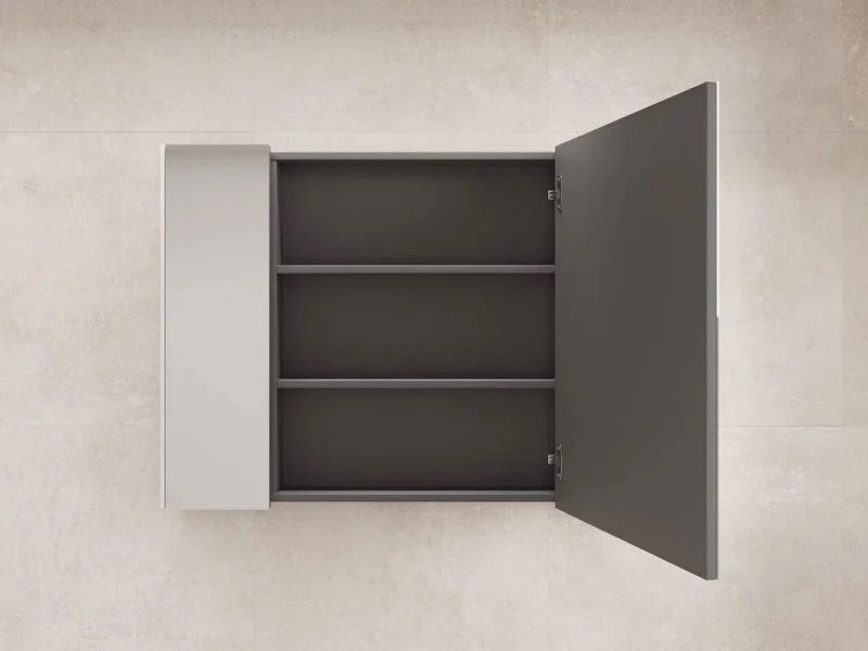 - Шкаф оснащен большим зеркалом, что делает его не только практичным, но и визуально увеличивает пространство ванной комнаты.