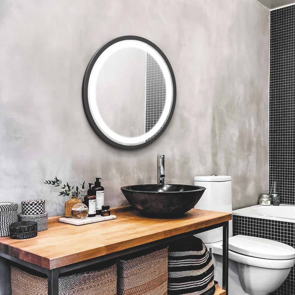 Зеркало с LED-подсветкой в стильной раме черного цвета. Модель сделана из стекла высшего качества M0 (влагостойкое, минимальные оптические искажения). Изделие оснащено сенсорным выключателем с функцией плавного диммирования, с запоминанием последнего значения. Короткие касания светящейся области включают/выключают подсветку, длительное касание меняет яркость свечения. LED-подсветка выдерживает до 50 тыс. часов работы в непрерывном режиме. Экологически чистый продукт выполненный по стандартам ЕС.Материал корпуса металлический профиль Крепление в комплекте